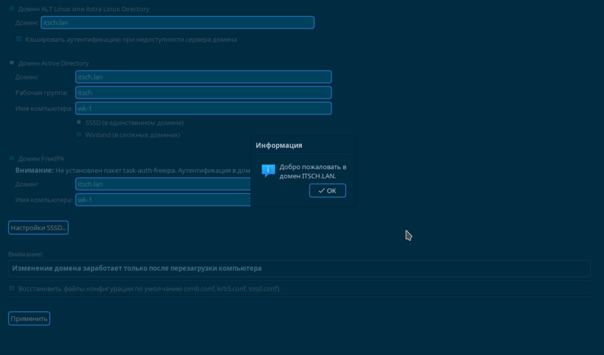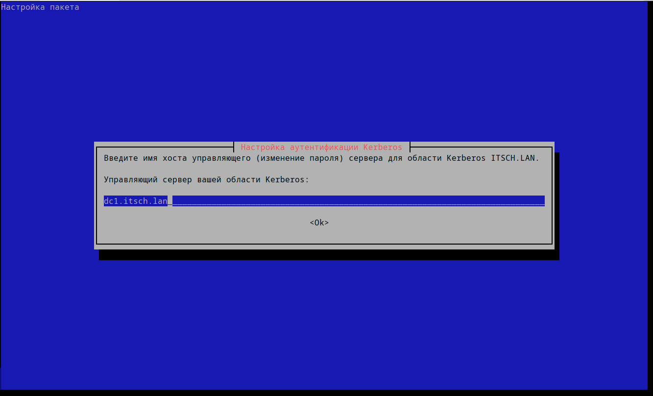 Указываем сервер Kerberos для области ITSCH.LAN: dc1.itsch.lan